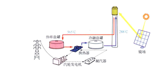 圖7. 7熔融鹽為介質(zhì)的太陽能塔式電站系統(tǒng)示意圖