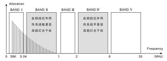 國(guó)際標(biāo)準(zhǔn)IEC 61603-1推薦了可用于音頻信號(hào)傳輸?shù)募t外輻射 調(diào)制頻段BAND Ⅱ(45kHz-1 MHz)和BAND IV (2MHz—6MHz)。其中BANDⅡ (45kHz-1MHz)主要用于會(huì)議用音頻傳輸系統(tǒng)及類似系統(tǒng):BAND IV (2MHz-6MHz)主要用于寬帶音頻及相關(guān)信號(hào)傳輸系統(tǒng)。